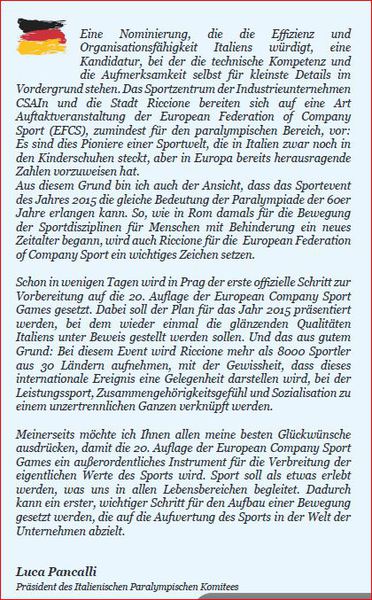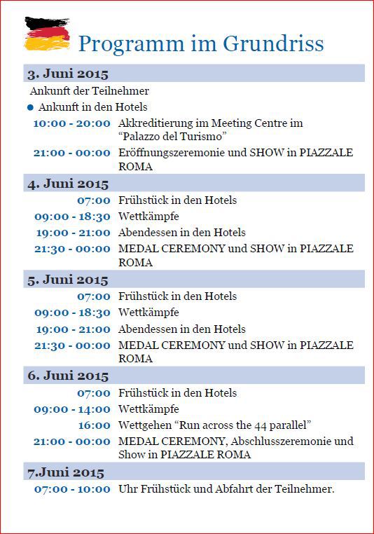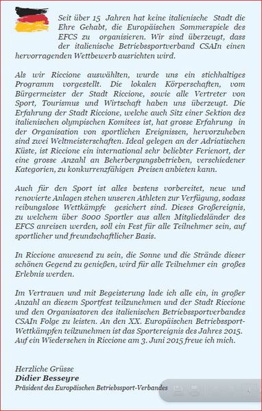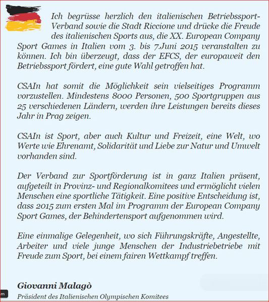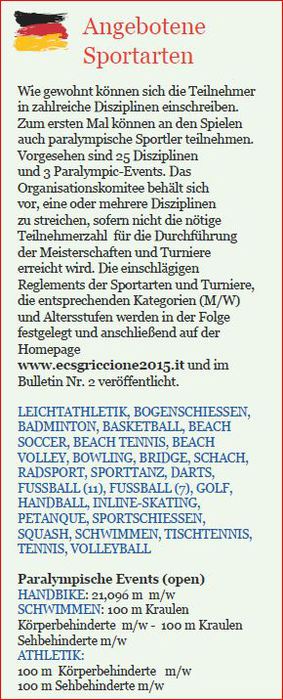 Es werden über 8.000 Betriebssportler aus ganz Europa erwartet, die in 28 Sportarten antreten und bei hoffentlich schönem Wetter in Riccione, an der italienischen Adriaküste, faire Wettkämpfe und ein großes Sportereignis feiern.