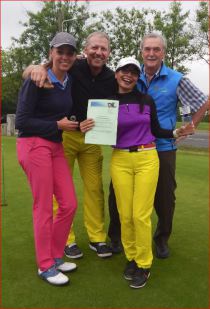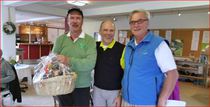 Die Organisatoren und die Teilnehmer waren so sehr mit der Nachlese für das Turnier beschäftigt, dass ein Gruppenbild aller Sieger/innen vergessen wurde. Die gute Stimmung kommt aber durchaus zum Ausdruck in dem einzigen Foto der Veranstaltung mit der Bruttosiegerin, der Zweitplatzierten und den freudestrahlenden Hubert Krämer und Bodo Christ.