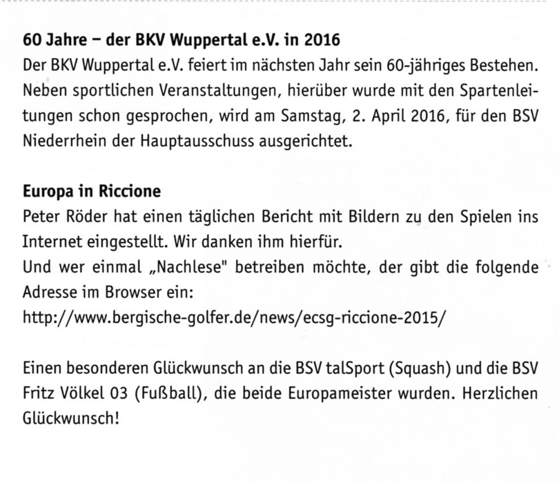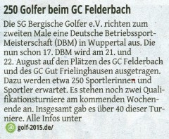 Um den Titel „Mannschafts-Kreismeister im Golf 2015“ kämpften 6 Teams von den Betriebssportgemeinschaften SG Bergische Golfer und BSV Delphi. Leider konnten die anderen Wuppertaler BSGen wegen Terminschwierigkeiten keine Teilnehmer nominieren. Den Titel holte die Mannschaft SG Bergische Golfer 1 (101 Nettopunkte bei 3 gewerteten Spielern) mit den Einzelspielern Peter Röder, Thomas Klein, Edward Gryndzieluk, Bodo Christ und Roland Samp. Auf dem 2. Platz kam überraschend die mit nur 4 Spielern angetretene Mannschaft des BSV Delphi (Björn Truxius, Ralf Immig, Heinz Engelhardt und Sandra Himmen) mit 95 Nettopunkten und den 3. Platz belegten die Spieler der SG Bergische Golfer 2 (Ralf Knebel, Grischka Schmitz, Armin Schröder und Maximilian Schröder) mit 87 Nettopunkten.