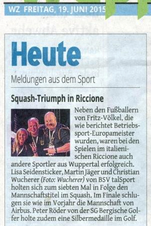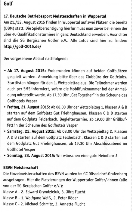 Deutscher Betriebssport-Mannschafts-Meister im Golf wurde das Team der BSG DZ-Bank Frankfurt vor BSG Köln 2 und BSV Delphi Wuppertal. Unter insgesamt 30 gemeldeten Mannschaften belegten auch die Teams von BSG Sparkasse KölnBonn, SG Bergische Golfer 2, SG Bergische Golfer 1 auf den Plätzen 4 bis 6 hervorragende Platzierungen. Mit den Plätzen 8 bis 10 für BTC SC 3 M, BSG Allianz Köln und BSG Stadt Köln 1 wurde die gute geschlossene Leistung der WBSV-Golfer abgerundet.