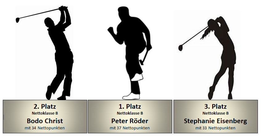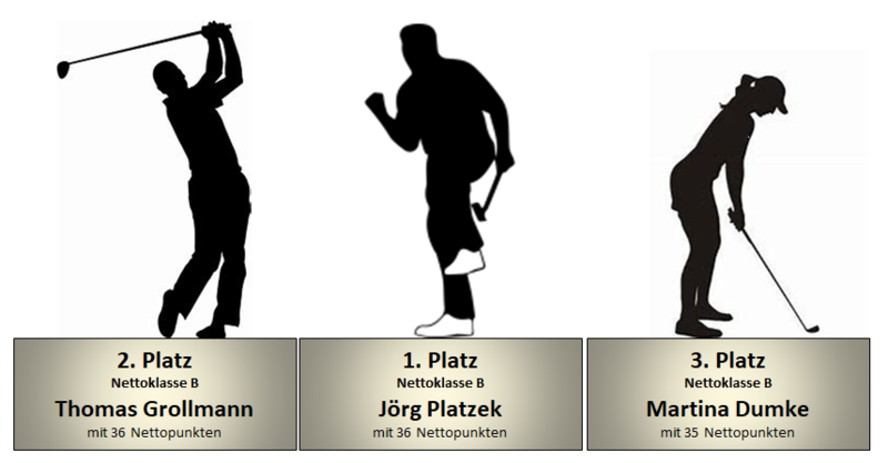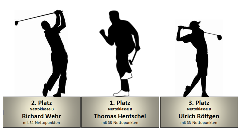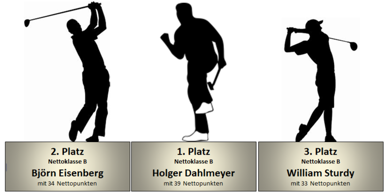 In der HCP-Klasse B von 22.0 bis 28,5 standen drei Spieler der SG Bergische Golfer auf dem Siegerpodest. Hier verbesserte Michael Schmitz, mit 39 Nettopunkten auch seine HCP-Vorgabe und mit je 36 Nettopunkten belegten Holger Dahlmeyer und Rüdiger Funke die Plätze 2 + 3.