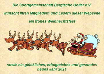 Da es in diesem Jahr wegen der Corona-Pandemie leider keine Weihnachtsmärkte gibt und daher unser alljährliches Treffen am Glühweinstand ausfallen muss, möchte der Vorstand der Sportgemeinschaft Bergische Golfer e.V. auf diesem Wege allen Mitgliedern des Vereins und auch den Lesern dieser Webseite eine schöne Adventszeit, ein frohes Weihnachtsfest und einen guten Rutsch ins neue Jahr wünschen.