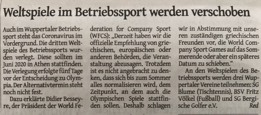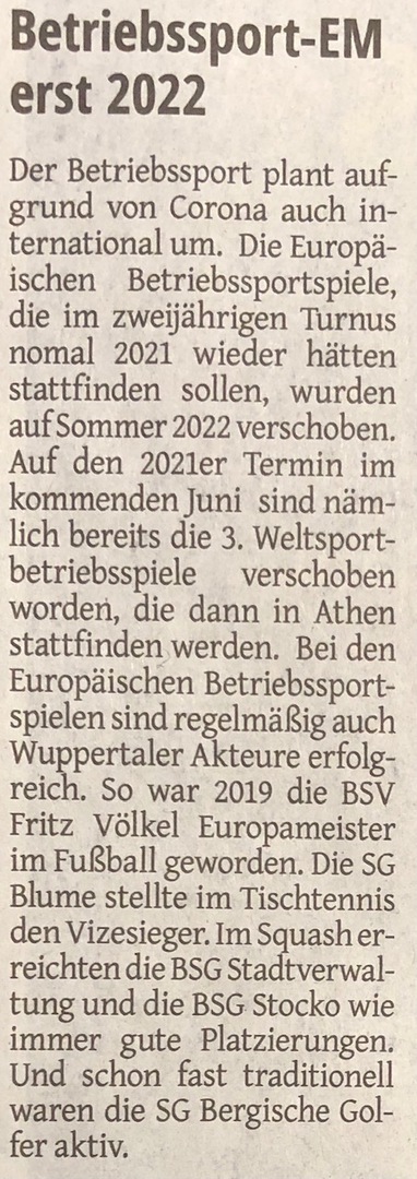 Die 23.Europäischen Betriebssportspiele in den Niederlanden finden nunmehr wegen der Corona-Pandemie erst im Sommer 2022