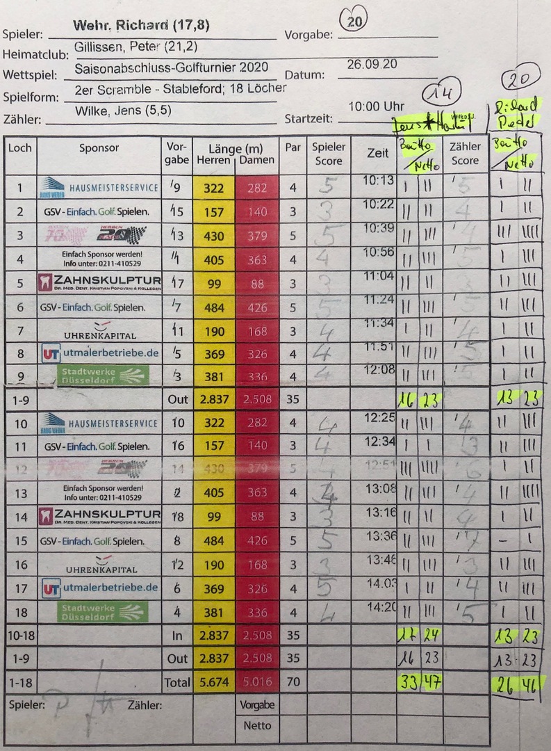 Schnell lagen dann auch die Gewinnerlisten vor und die Siegerehrung konnte durchgeführt werden. An dieser Stelle noch mal meinen Dank an das Team im Sekretariat um Corina und Niklas Gothe für die Hilfe bei der Auswertung der Scorekarten.