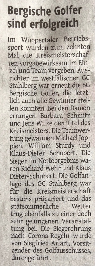 Bereits zum 10. Mal trugen Wuppertaler Betriebssportgolfer vorgabewirksam ihre Kreismeisterschaften im Einzel und in der Mannschaft aus. Am 19.09..2020 gingen im westfälischen GC Stahlberg im Lippetal insgesamt.....