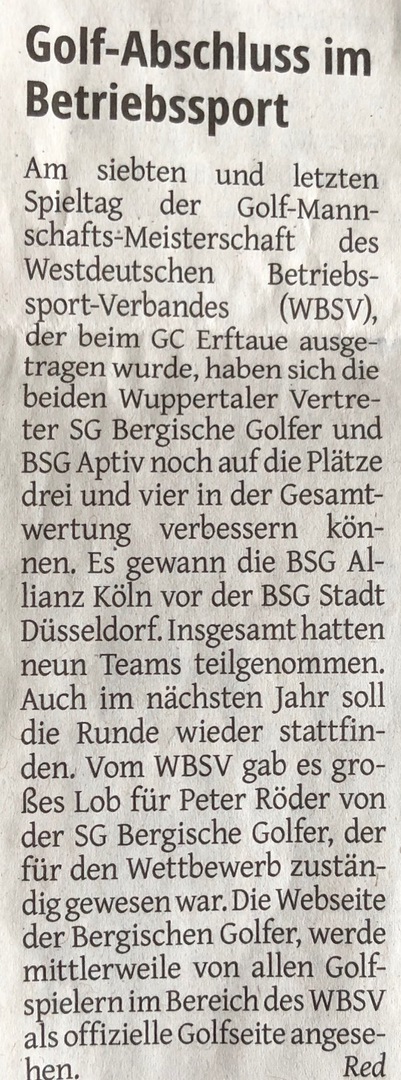Er bedankte sich noch einmal bei Peter Röder für die Organisation der WBSV-Mannschafts-Meisterschaft sowie für die Bearbeitung der Webseite der Sportgemeinschaft Bergische Golfer e.V., die mittlerweile von fast allen Golfspieler*innen aus dem Bereich des WBSV als „offizielle“ Golfseite angesehen wird und auf der man sich immer aktuell über den Golfsport der Betriebssportler informieren kann.