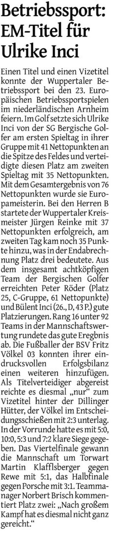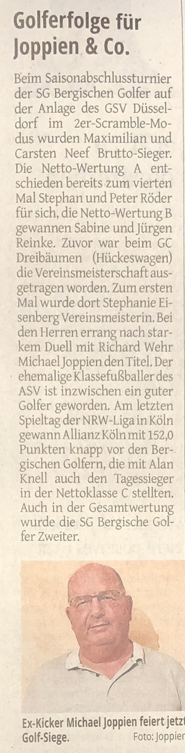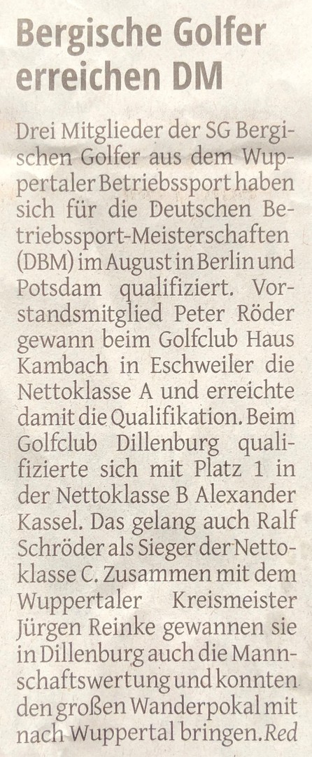 Da dieser Spieltag auch gleichzeitig ein Qualifikationsturnier zur 22. Deutschen Meisterschaft im August in Berlin/Potsdam war, ist noch zu erwähnen, dass William Sturdy von der SG Bergische Golfer (Doppelmitgliedschaft bei der BSG Stadt Köln), der in seiner Nettoklasse den 1. Platz belegte, sich für die 22. DMBG qualifiziert hat.