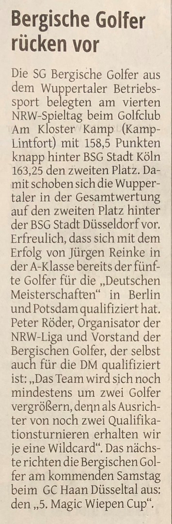 am 16.07.2022 richtete die BSG Stadt Düsseldorf, bei bestem Golfwetter, den 4. Spieltag der diesjährigen WBSV-Mannschafts-Meisterschaft im GC Am Kloster Kamp aus. Das Turnier um den "Kloster-Cup" war auch gleichzeitig ein Qualifikationsturnier zu den 22. Deutschen Betriebssport-Meisterschaften, die vom 25.-27.08.2022 in Berlin/Potsdam ausgerichtet werden.
