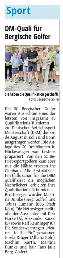 Bei dem Qualifikations-Turnier der BSG Provinzial Münster zu den 24. Deutschen Meisterschaften der Betriebssportler im Golf konnten sich am 15.06.2024, auf der Anlage des Golfclub Wasserschloss Westerwinkel, zwei Spieler der SG Bergische Golfer erfolgreich ins Bild setzen und die Qualifikations-Urkunden in Empfang nehmen.