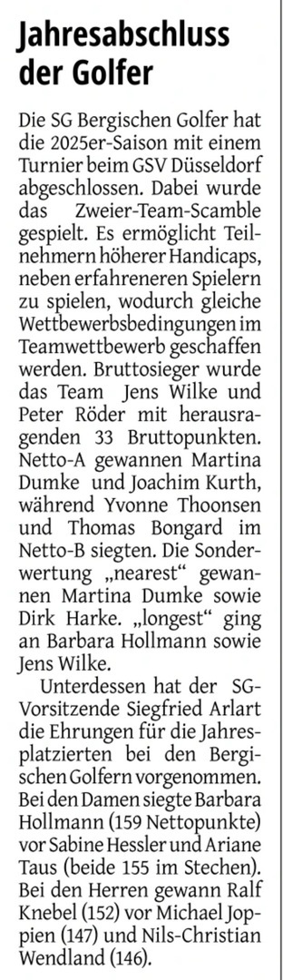 Der Vorstand bedankt sich auf diesem Wege auch noch einmal für die zahlreichen freundlichen Beiträge zu unseren Aktivitäten rund um unsere Sportgemeinschaft Bergische Golfer und wünschen alles Gute für den Rest der Golfsaison und für 2026 jetzt schon eine gute Zeit.