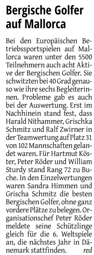 Die SG Bergische Golfer hatte zu dieser Veranstaltung, an der über 5.500 Betriebssportler aus ganz Europa teilnahmen, 8 Mitglieder für das Golfturnier angemeldet. Diese wurden mit einem kleinen Zuschuss des Vereins und des Betriebssport-Kreisverbandes Wuppertal dankenswerterweise unterstützt.